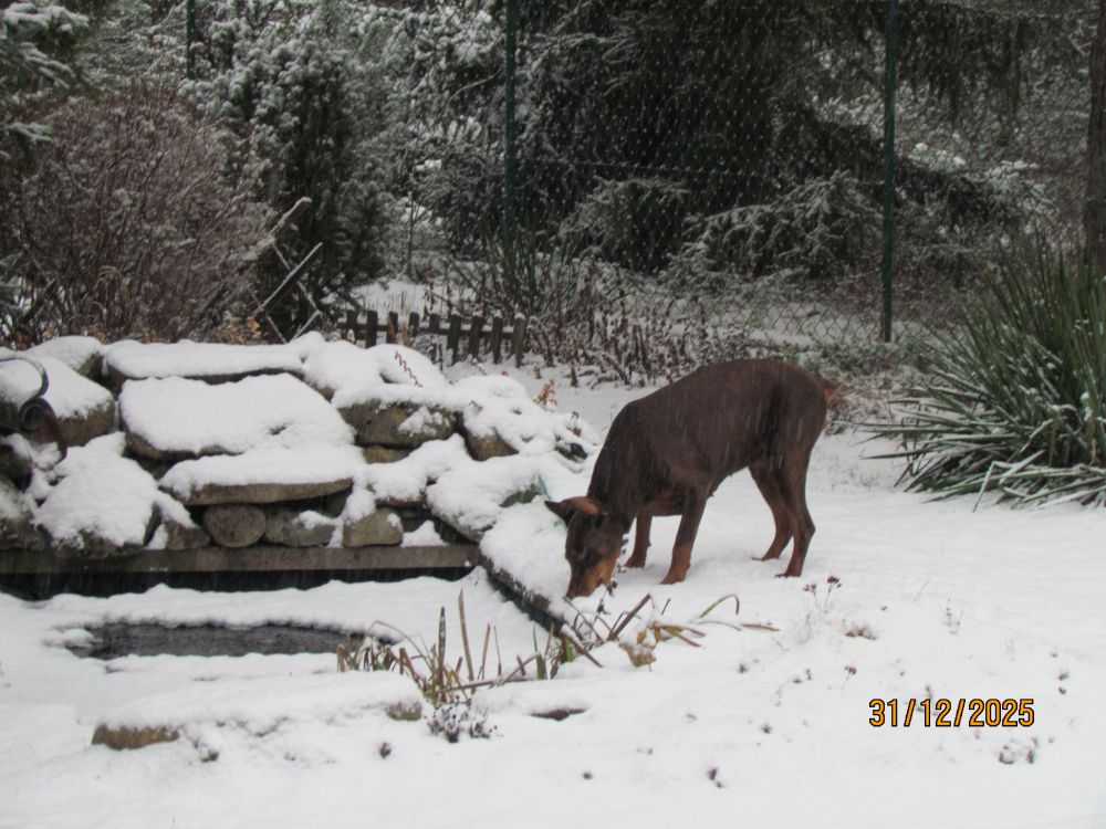 Jednak zima dała o sobie znać już w sylwestrowy dzień. Zrobiło się biało i mroźno. Nareszcie jest tak, jak to dawniej bywało. Nie ukrywam, że największym problemem jest zamarznięte oczko wodne, które dla Zuli jest jedynym źródłem wody do picia. Znalazłam jednak sposób, aby razem z karmą przemycać chociaż odrobinę płynów. Większą ilość Zula uzupełnia jedząc śnieg.